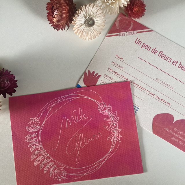 La carte cadeau Mêle-fleurs vous permet d'offrir des bouquets, des créations en fleurs séchées ou des vases en livraison ou retrait sur les points de ventes !
